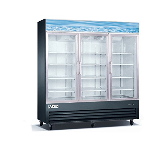 72 cubic feet, Black coated steel cabinet, aluminum interior & stainless steel floor, Operating temperature range 33° to 41°F, Double pane fog resistant glass doors, 3 self-closing swing doors with positive seals, Rounded corner design inside of the cabinet, Interior lighting, 12 PVC coated adjustable steel shelves, Foamed-in-place polyurethane high density cell insulation – CFC Free.Bottom mount compressor provides more efficient operation and easy access, No stoop lower shelf, Easily accessible condenser coil, Forced air system with electronic temperature control, Simple installation with no plumbing required, 4 heavy duty 4″ casters, including 2 locking. NEW in Box – Factory Sealed.External dimensions: 78.3″ x 30″ x 80.7″, Voltage: 115/60/1, 14.5 Amps, 3/4+ HP compressor, NEMA 5-20P plug and 8 ft. power cord included, ETL certified to NSF 7, ANSI 7, UL 471 & CSA C22.2 standards. 1 Year Parts and Labor Warranty, 5 Year Compressor Warranty.FREE DELIVERY INCLUDES LIFT GATE SERVICE.